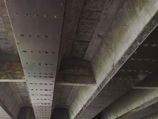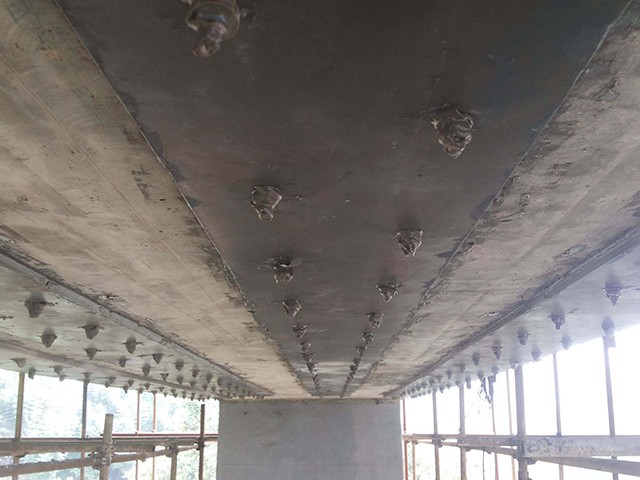 用粘結劑粘貼鋼板補強、加固的鋼筋混凝土結構構件,能大大提高其原設計承載力和抗破壞能力。這是因為粘貼鋼板后,提高了原結構構件的配筋量,相應就提高了結構構件的抗拉、抗彎、抗剪等方面的力學性能,而這些性能是靠結構膠粘劑的良好粘結性能,把鋼板與混凝土牢固地粘結在一起,形成整體,有效地傳遞應力,共同工作來的。